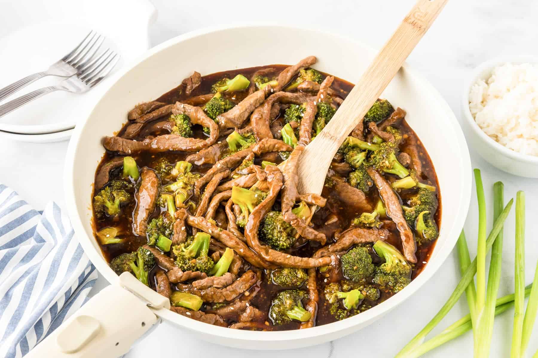- Add the beef and broccoli to the sauce. Toss to coat the meat and vegetables evenly in the sauce until hot, then serve with rice and enjoy! Garnish with green onions or sesame seeds if desired.green onion and sesame seeds