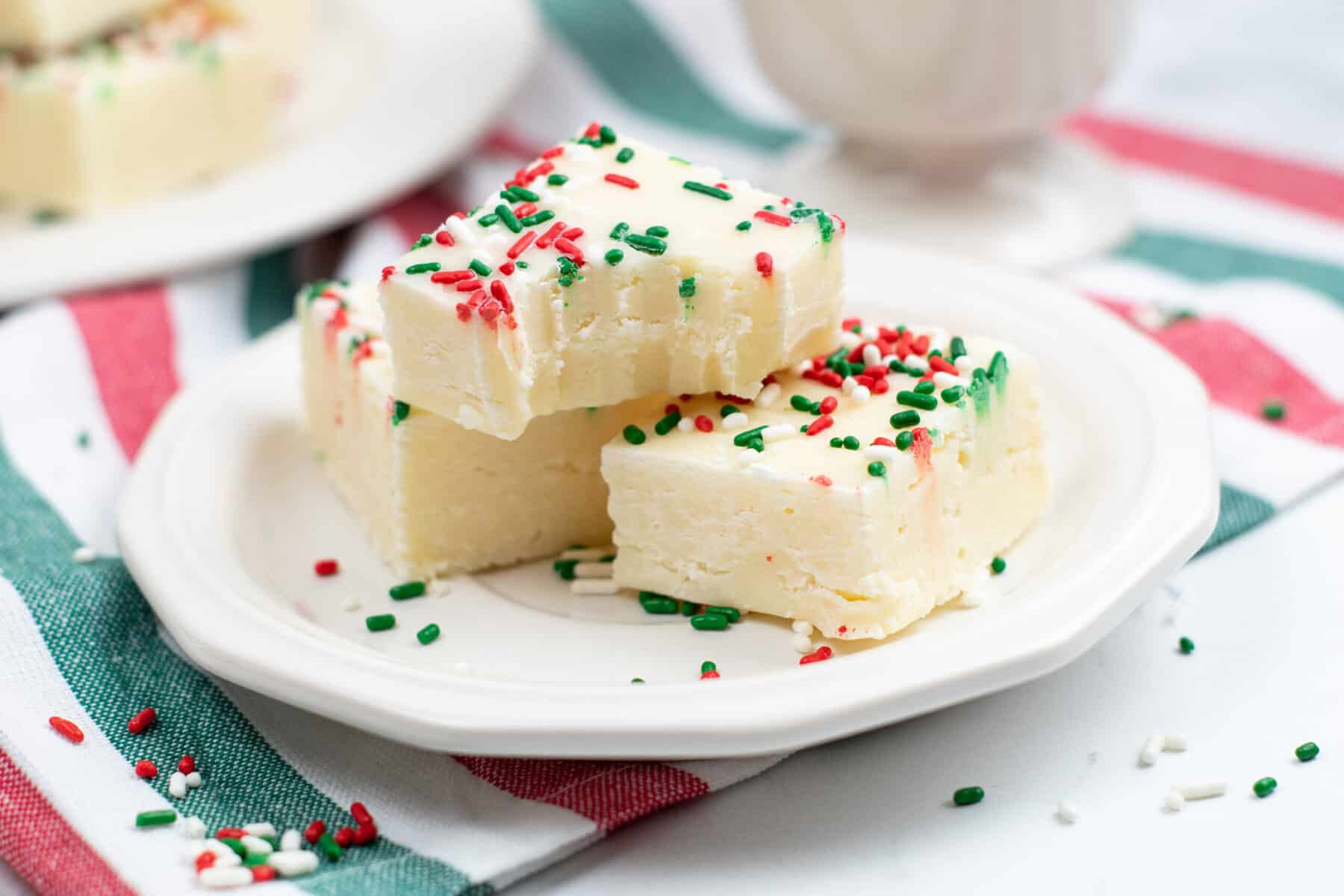 Change The Sprinkles– You can use any kind of sprinkle you prefer! You can use any kind of sprinkle you have! I think this Christmas fudge recipe is fun to add all kinds of holiday sprinkles on top. Sometimes I’ll use up the last bits of all of my jars of holiday sprinkles for a mix on top, it’s a great way to use up those odds and ends.